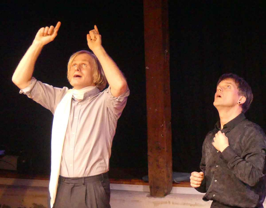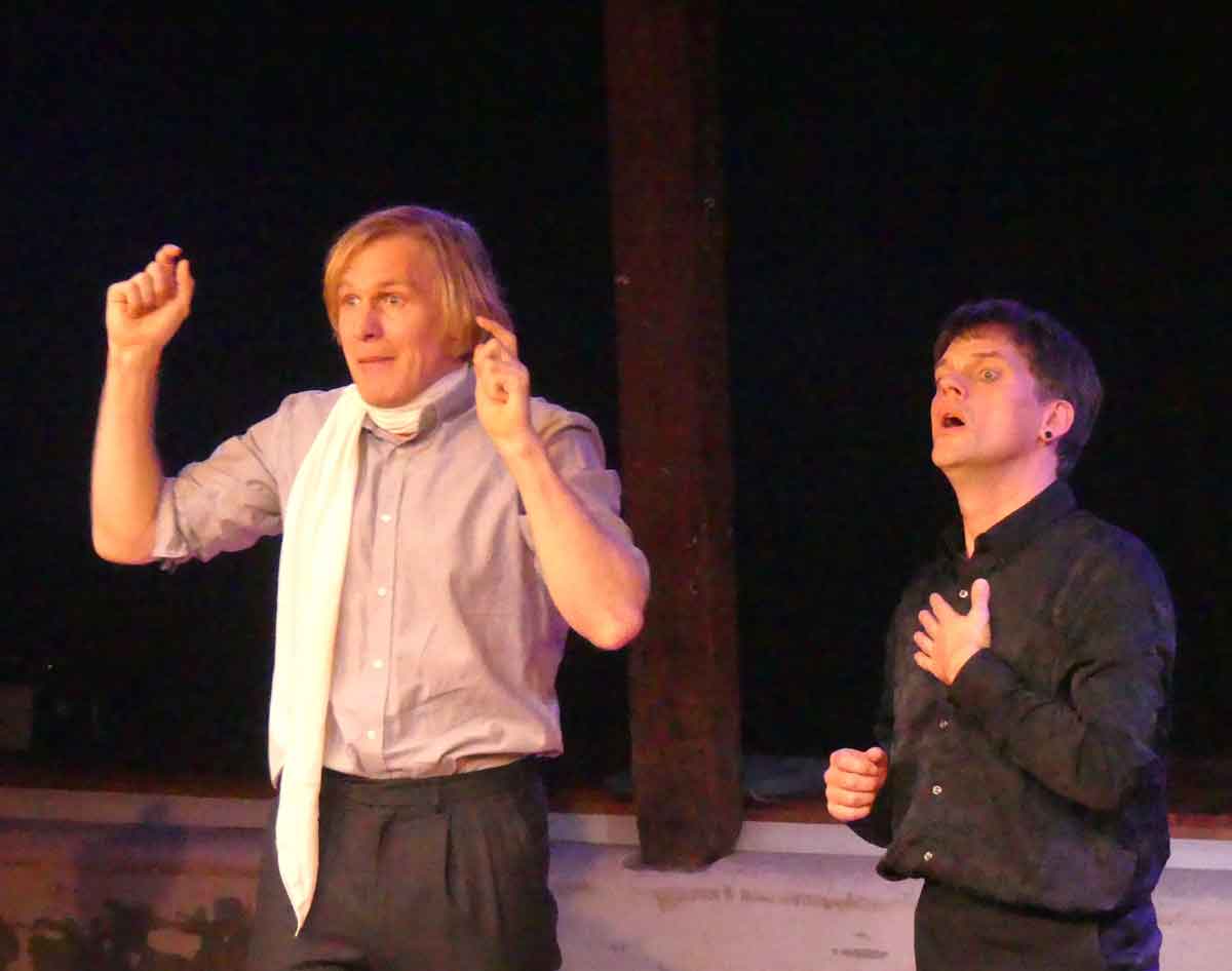 „Der Geisterseher“ wollte auch nur unterhalten. Das Jahrmarkttheater Bostelwiebeck eröffnete damit seine Saison und hatte – als Wiederholung – die beiden jungen Mimen Schröder und Zett eingeladen. Im Jahr 2009 entstand diese Inszenierung als Diplomarbeit des Regisseurs Antú Romero Nunes an der Hochschule für Schauspielkunst „Ernst Busch“ Berlin. Seitdem feiert sie Erfolge, am Maxim-Gorki-Theater Berlin, am Thalia Theater Hamburg und nun auch reisetauglich. Die Handlung ist so verworren wie unwahrscheinlich. Ein melancholischer deutscher Prinz, der „in einem geräuschvollen Gewühle von Menschen einsam (ging)“, gerät in den Bann schicksalhafter Mächte, merkwürdiger Zufälle und durchschaut nicht, dass er manipuliert und getäuscht wird. Die Schönen, Reichen und Mächtigen führt der Dichter in Venedig (!) zusammen. Der Karneval tut übriges. Am Ende geht es wie immer um Geld, Einfluss und Macht. Die Forderung des Prinzen an seinen Freund „Zeig mir etwas, das dauert, damit ich tugendhaft sei“, klingt nach Goethes „Faust“, funktionierte aber noch nie. Und will man in den ganzen Irrungen und Wirrungen einen Sinn erkennen, so ist es der nach dem des Lebens. Nach ein bisschen Glück. Eine Antwort hat natürlich auch Schiller nicht.
