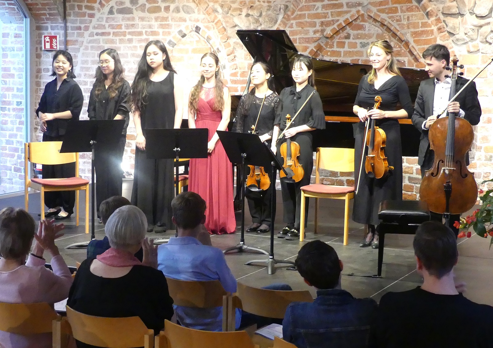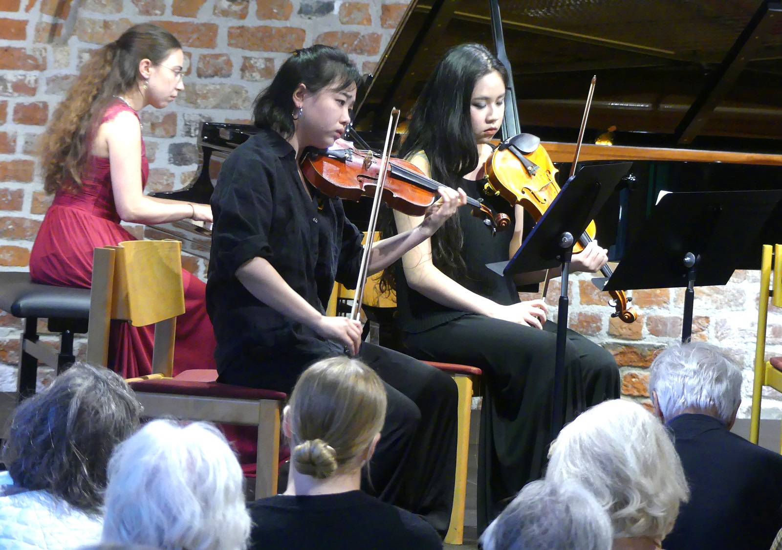 In die vier Sätze Allegro, Andante/Adagio, Scherzo/Allegro und das Finale/Allegro teilten sich Saki Shimomiya (Japan/26), Chun-Chen Wang, Yun-Chen Wu (beide Taiwan/21) und Yang Zheng (China/24). Am Flügel saßen Iva Zurbo (Albanien/23) und Zihan Li (China/16). Carolin Frick und Mark Schumann waren die souverän und überzeugend agierenden Dozenten an Viola und Violoncello. Die Akteure ließen den Brahms`schen Tragödienton nie dominieren, die Spannung des am Ende umjubelten Spiels bezog das Quintett aus der immer angemessenen Mäßigung des „symphonischen Füllhorns“, aus der wohldosierten Opulenz und der nie sinnentleerten romantischen Emphase. Es war atemberaubend.