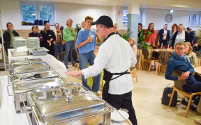 Jens Dannenfeld präsentiert seine Kochkünste. Foto: Dirk Marwede Robert Bosch Stiftung zu Gast in der Schulmensa des LeG Sternekoch Jens Dannenfeld hat aufgetischt: Rosmarinkartoffeln, Lauchtaschen, gegrillter Kürbis, eine Kürbis-Curry-Soße sowie eine Tokio-Pecana-Pasta warten auf die ...