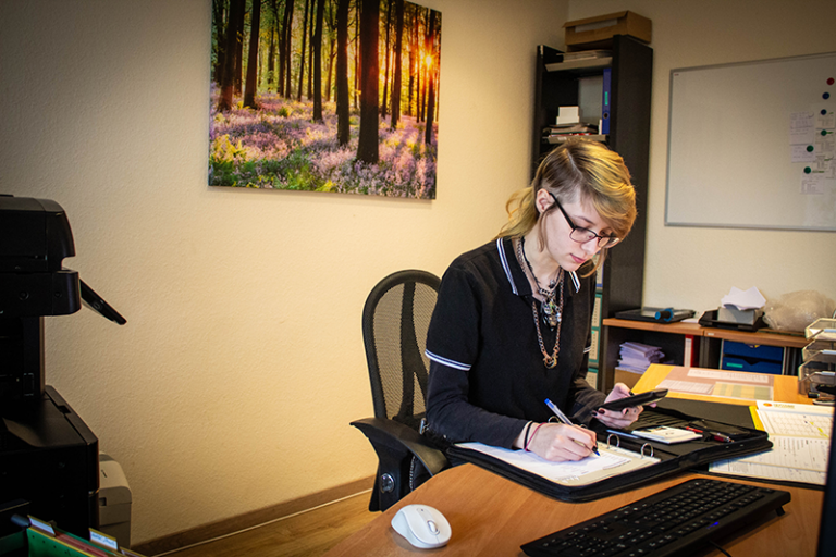 Praktikantin Madison bei der Arbeit im Büro / Foto: Natalie Engel Die Arbeit von Bestattern, auch von Tierbestattern, ist wichtig und erfordert viel Feingefühl. Trauernden